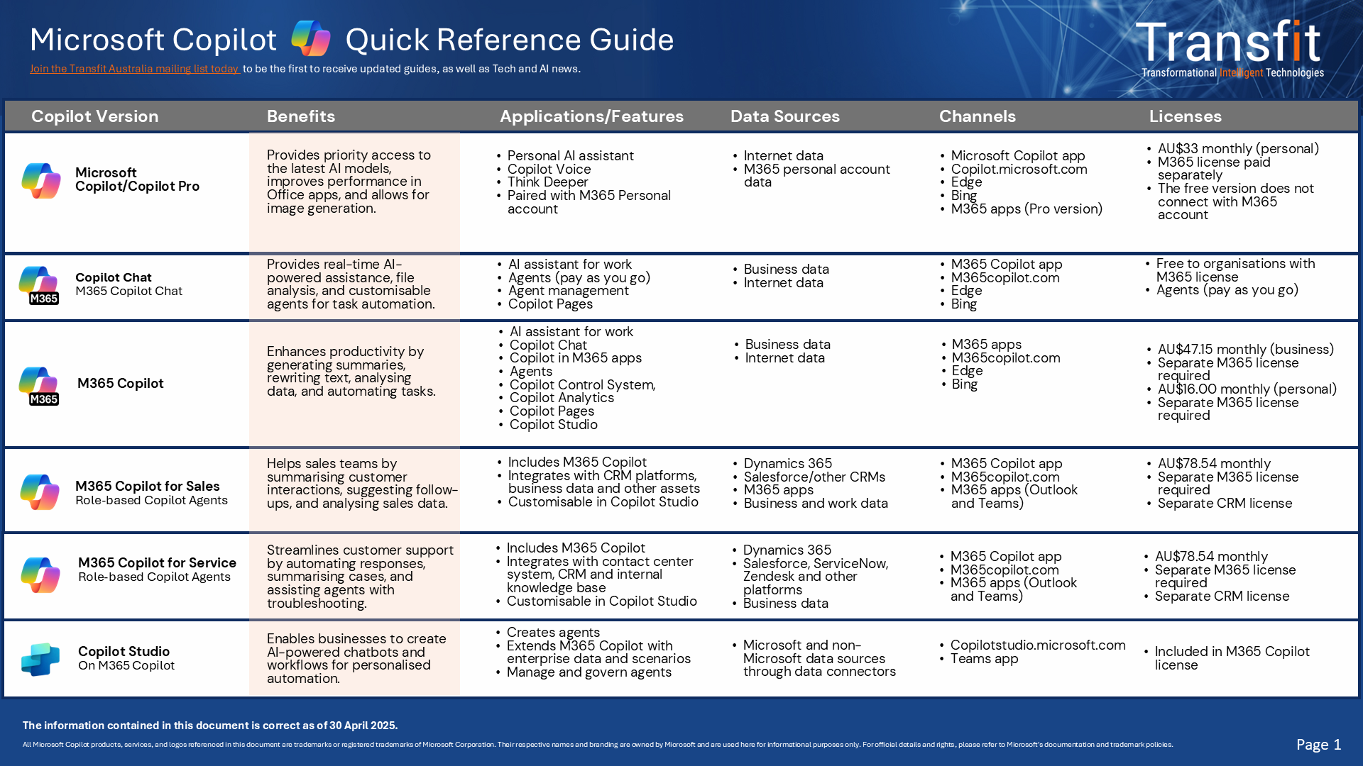 Download the guide today to quickly discover the different versions of Copilot, how they're used, and the benefits they deliver to you and your business.